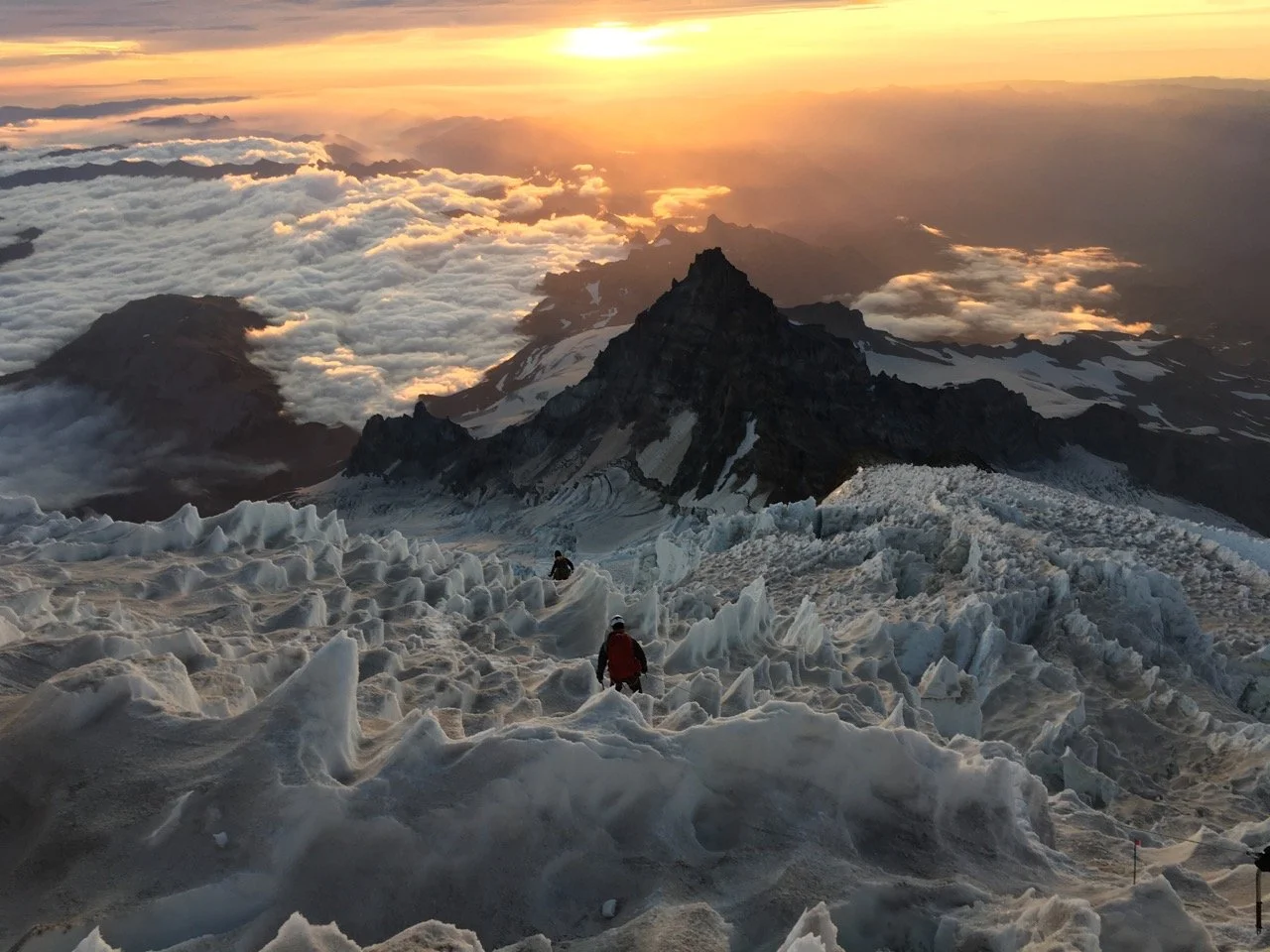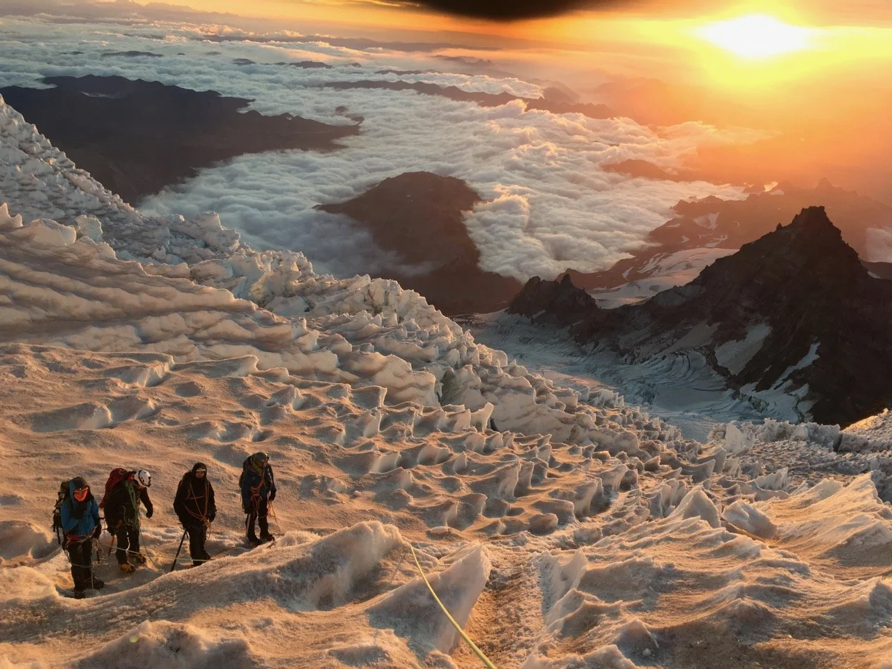 For hours, we navigated the Ingraham Glacier and the Disappointment Cleaver. As dawn approached, we were rewarded with a spectacular sunrise at around 12,600 feet—a moment of breathtaking beauty in an otherwise formidable environment.